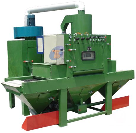 ▓ 原理說明: 采用三角皮帶輸送工件,不會(huì)積砂,皮帶速度配合噴砂工藝要求可實(shí)現(xiàn)變頻調(diào)速;每支噴槍角度可自由調(diào)節(jié)槍架實(shí)現(xiàn)自動(dòng)變頻搖擺,并可定點(diǎn)噴砂,靈活性強(qiáng)、適用 性廣;采用先進(jìn)的旋風(fēng)分離系統(tǒng)配置,粉塵分離效果好,噴砂效率高;采用PLC電氣先進(jìn)控制系統(tǒng),自動(dòng)化程度高,穩(wěn)定性好,故障率低;噴嘴采用特制高耐磨硼材料,使用壽命長;獨(dú)立的布袋式除塵系統(tǒng),抽塵通風(fēng)效 果良好;(也可選用;脈沖濾芯式除塵);磨料回收采用螺旋輸送及氣力回收相結(jié)合,回收穩(wěn)定性好。 ▓ 輸送式噴砂機(jī)特點(diǎn): 1,本機(jī)在加工時(shí)為封閉式,不會(huì)污染環(huán)境; 3,可根據(jù)噴砂工件需要,輸送帶速度采用變頻器控速;