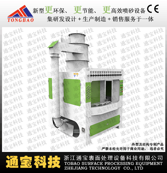 本機(jī)為圓鋼、鋼管自動送料的高功能清理作業(yè)機(jī)。放在錐輥上的圓鋼、鋼管自動輸入清理室內(nèi)拋射區(qū)時,邊前進(jìn)邊旋轉(zhuǎn)的圓鋼、鋼管圓周外表連續(xù)不斷地接受縱向拋 出高速彈丸流束的打擊與磨擦,使之氧化皮、銹層及異物迅速脫落,顯露出金屬本色。在清理室外,兩邊輥道裝卸工件。清理過程中,撒落下來的丸塵混合物經(jīng)室體 漏斗,縱橫螺旋輸送匯集于提升機(jī)下部,再提升到機(jī)器上部的分離器里,分離后的好彈丸落入料斗內(nèi)供拋丸器循環(huán)使用;拋丸清理中產(chǎn)生的塵埃,由抽風(fēng)管送向除塵 系統(tǒng),凈化處理后的凈氣排入大氣中,顆粒狀塵埃被捕捉收集。(注:可以根據(jù)顧客要求定制)